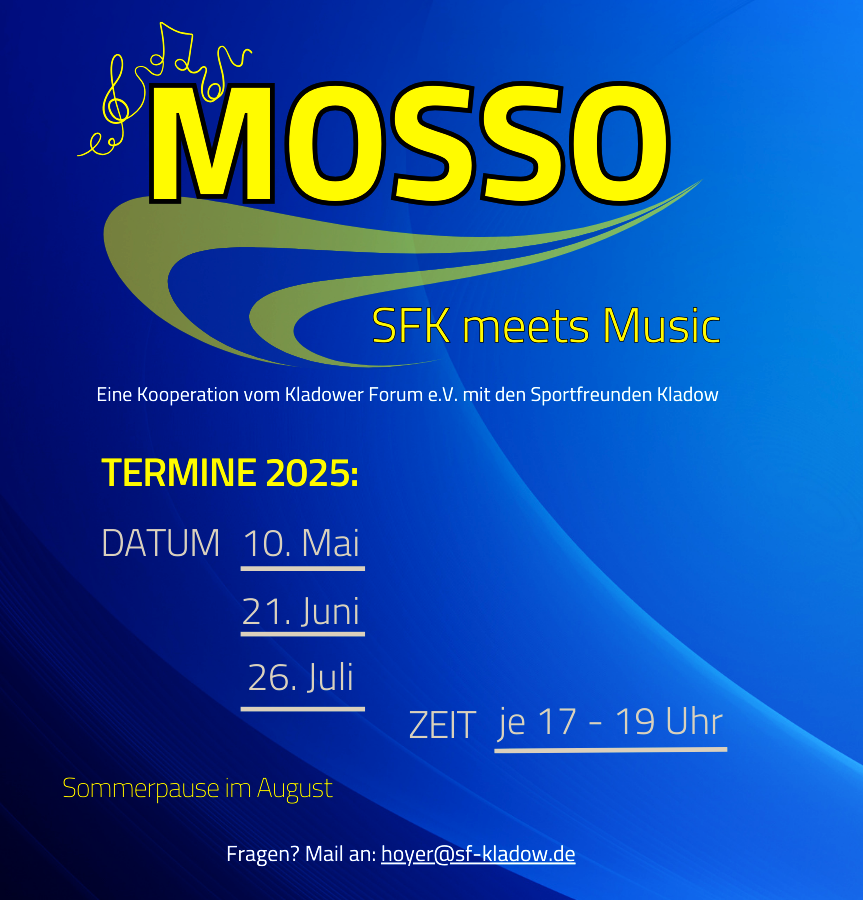 Liebe Musik- und Sportfreunde, aufgepasst, es geht weiter. Nach MOSSO …ist vor MOSSO – bereits am 10. Mai geben die Sportfreunde Kladow ein weiteres Mal Gas in Sachen Musik im Vereinsheim: Musik schafft Stimmung und Gemeinschaft, ist voller Leben und letztendlich im Stande uns hervorragend zu unterhalten.