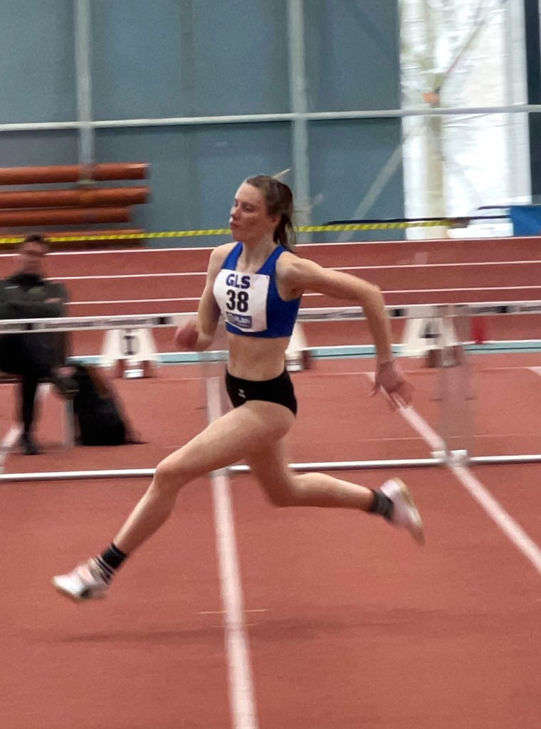 Kai: „Sina wagte sich auch in dieser Woche an die 400 m – das hieß zwei Runden in der Halle am Luftschiffhafen. Sie war total cool und gelassen und ist auch genauso „abgebrüht“ ihre Strecke gelaufen. Erst blieb sie im Windschatten ihrer Gegnerin, ist aber hinten raus noch an ihr vorbei gezogen, super Einteilung!“ – Sina: „Vorher war ich nicht wirklich aufgeregt, das kam erst, als ich im Innenraum auf meinen Lauf gewartet habe. Da ich auf Bahn 4 starten musste, war es ein anderes Gefühl, die steilen Kurven zu laufen, als wenn man auf den flacheren Bahnen 1 oder 2 ist. Zudem muss man die ersten 150 m sehr aufpassen, wirklich in der Bahn zu bleiben und erst dann in die Innenbahn reinzuziehen. Auch wenn ich meine Bestzeit knapp verfehlt habe, war ich mit dem Wettkampf und dem Verlauf doch sehr zufrieden. Es hat wieder sehr viel Spaß gemacht!“