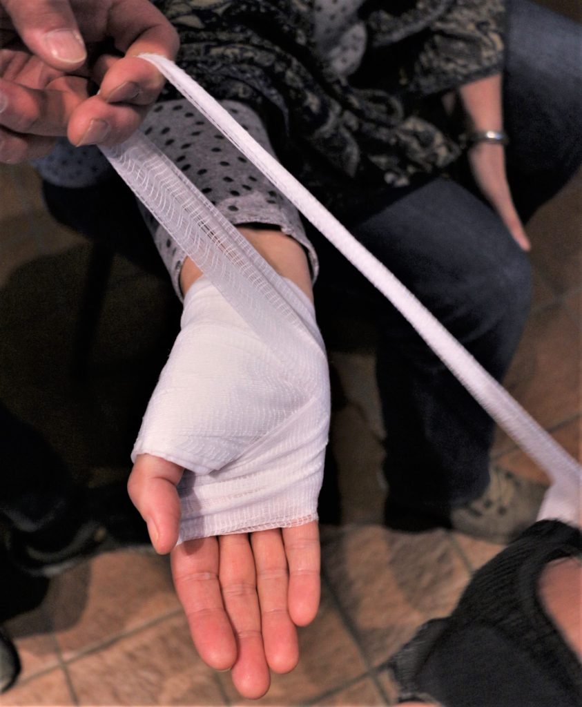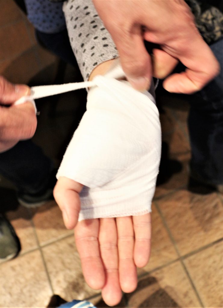 Ebenso ging es um die große Bedeutung von Nitril-Handschuhen, zum Schutz vor Infektionen. Wie wird ein Verband richtig angelegt und wie hält er, wenn kein Fixiermaterial zur Hand ist.