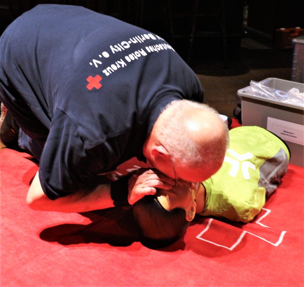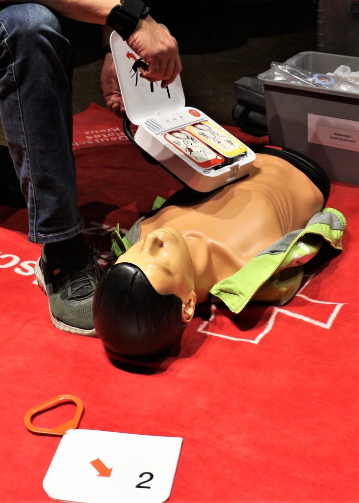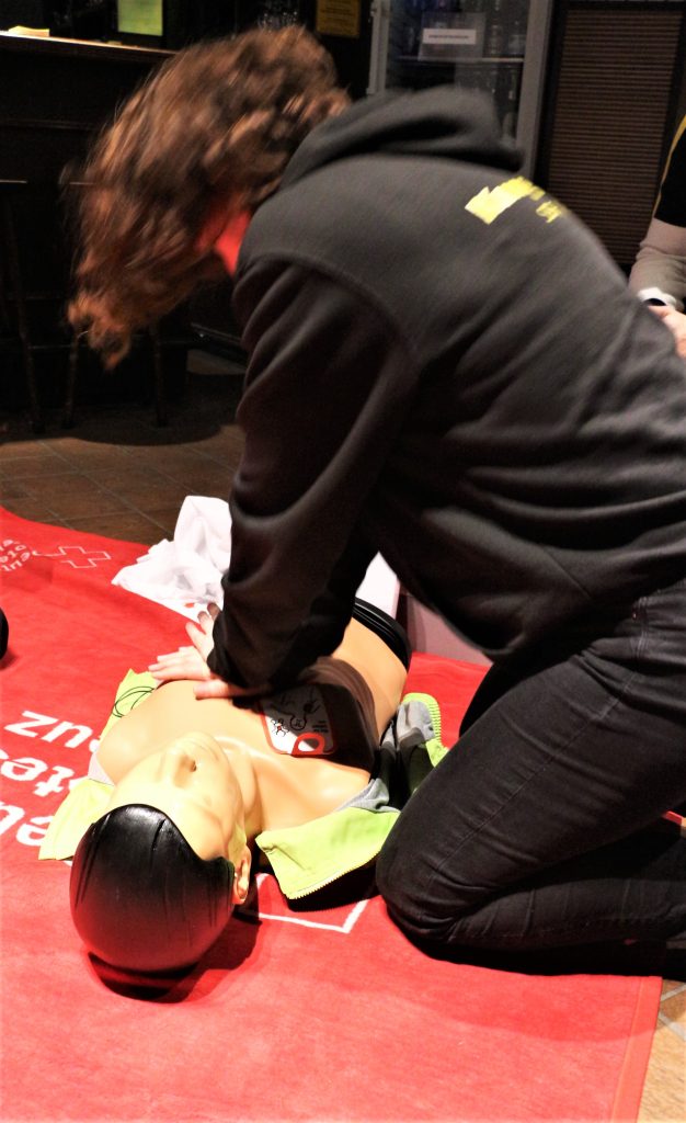 Einen Notruf aus dem Vereinsheim spielten wir nach. Wir besprachen Schutzmaßnahmen für die eigene und die betroffene Person, sowie die der Sportgruppe. Auch notwendige Wiederbelebungsmaßnahmen rückten in den Vordergrund, wurden hinterfragt und in praktischen Übungen an einem Modell erprobt.