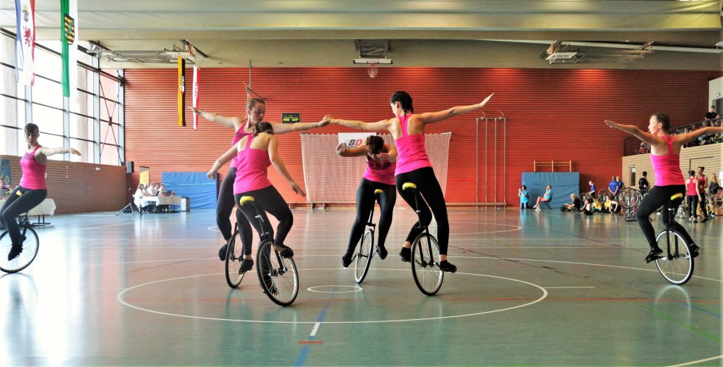 Im Kunstradsport gibt es Einer-, Zweier-, Vierer- und Sechser-Kunstradfahren sowie 4er – und 6er Einradfahren.