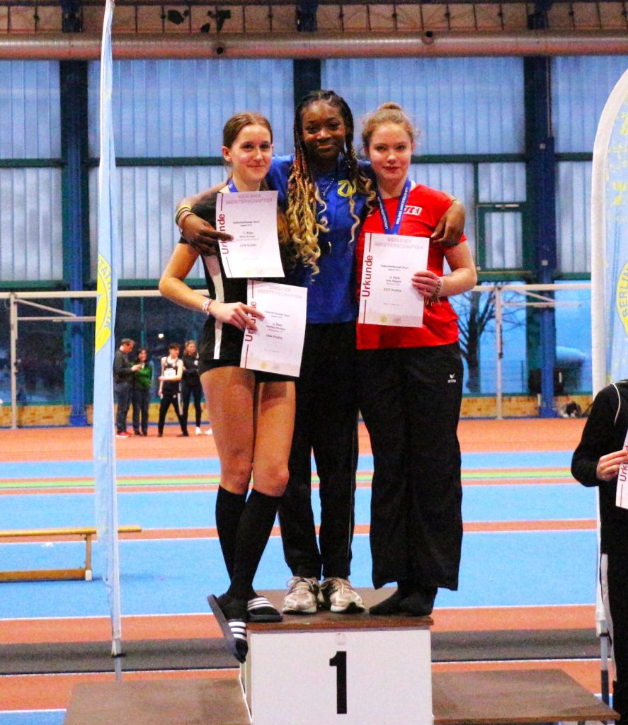 Bei der Siegerehrung dominierten die Farben blau gelb mit Melissa als neue Berliner Meisterin im Hallen-Mehrkampf, mit Vanessa, Jana, Charlotte und Vanesa, die sich die Plätze 4, 5, 7 und 8 erkämpft haben. Malina belegte mit nur 29 Punkten weniger einen guten 14. Platz und Lennja, die erst seit wenigen Monaten bei der Leichtathletik ist, einen tollen 37. Platz.