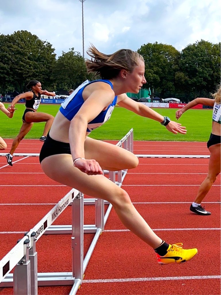 Der erste Wettkampftag begann bei guten äußeren Bedingungen mit den 100 m Hürden. Lole machte sich ruhig und abgeklärt warm, keine Nervosität sichtbar, bis… 45 Minuten vor dem Start. Auf einmal fehlte die Lockerheit. Die Starts waren nicht gut. Nochmal beruhigen und gut zusprechen. Das half …oder auch nicht – Fehlstart. Zum Glück ist einer erlaubt. Der Zweite glückte und Lole war da! 15,20 s sind nur wenig über PB.