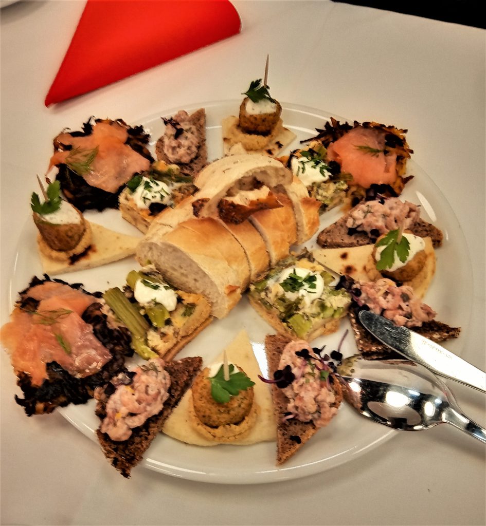 Bevor es um 18:30 Uhr mit der Begrüßung losging, gab es ein Gläschen Sekt, bzw. Orangensaft und am Tisch erwarteten uns alle kleine Häppchen.