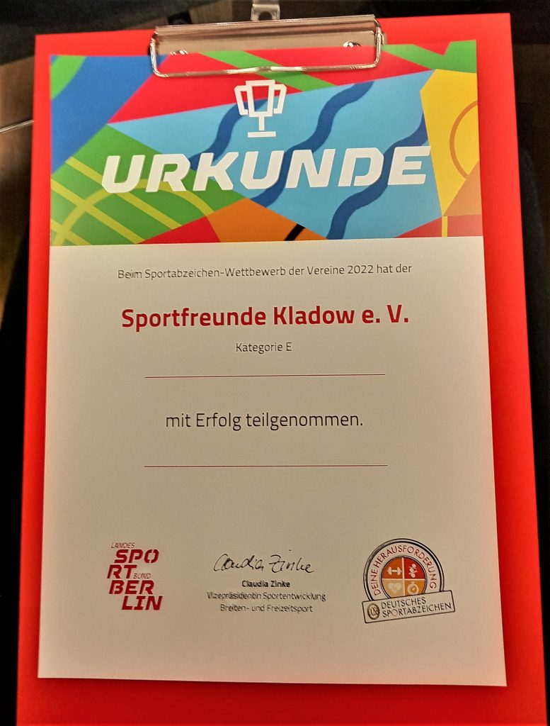 Mit einem gut organisierten Zeitplan wurden in der feierlichen Ehrungsveranstaltung Urkunden sowie Sach- und Geldprämien in 6 Kategorien vergeben und die Vertreter der Vereine einzeln auf der Bühne geehrt. In die Wertung kamen alle Sportabzeichen, die im Kalenderjahr 2022 über den Verein vergeben werden konnten. SF Kladow erreichte in der Kategorie E: über 1.000 Mitglieder Platz 11.