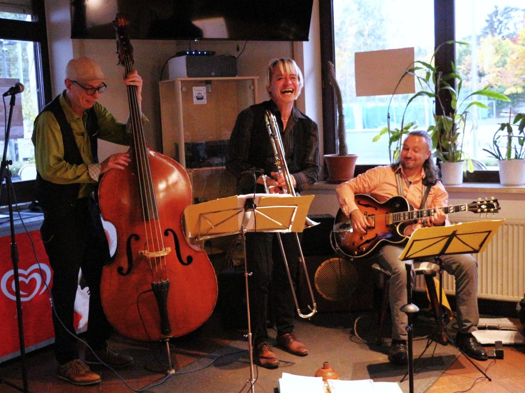 „MOSSO – SFK meets Music“, nach einer zweimonatigen Sommerpause: Punkt 17 Uhr hat Dr. Gregor Ryssel, seines Zeichens stellvertretender Vereinsvorsitzender der Sportfreunde Kladow, den musikalischen Ohrenschmaus des Kladower Forums und des SFK am Samstagabend eröffnet. Wir hatten Vollblutmusiker zu Gast und es versprach, von Beginn an unterhaltsam und eine perfekte musikalische Begleitung zu werden – eine brillante Entscheidung also, um diesen Abend am 11. Oktober – zum zweiten Mal in diesem Jahr – zu einem unvergesslichen Erlebnis zu machen. Mit ihrem einzigartigen Klang und ihrer flexiblen Besetzung hat das energiegeladene Trio um Julian Gretschel die Atmosphäre in unserem Kladower Vereinscasino zur musikalischen Showbühne gemacht und 40 nicht nur sportbegeisterte Gäste wiederholt in die Musikwelt von „The Swingin‘ Steam Engine“ eintauchen lassen.