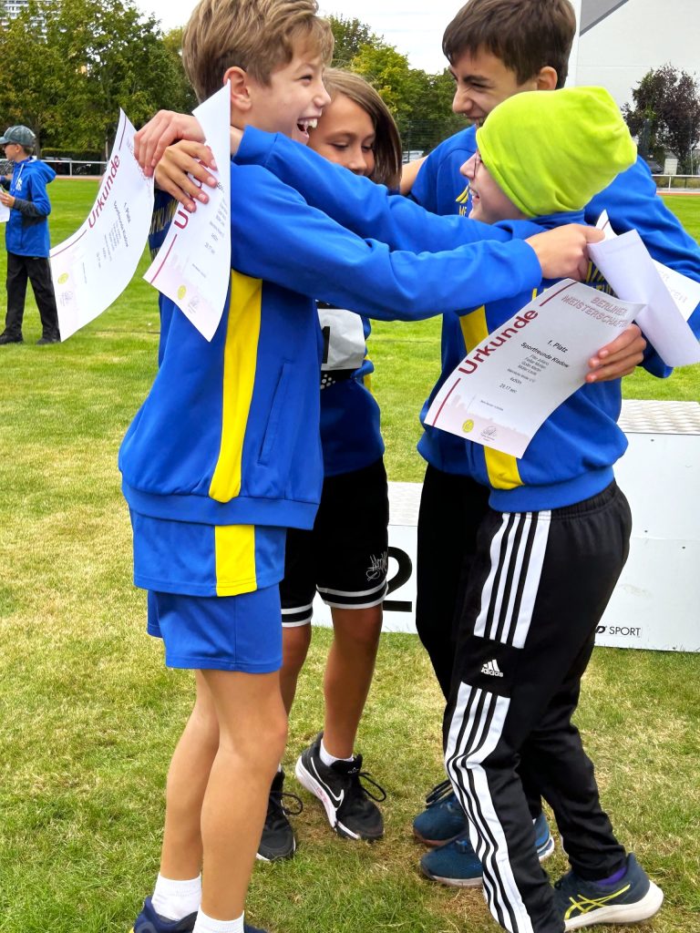 Damit war es aber noch nicht vorbei: Kurz vor Ende des Wettkampftages stand noch das Highlight an – und damit ist nicht Julianos bravouröses Durchkämpfen durch die 800m oder der sehr gute Schlagballwurf der älteren Jungs gemeint, sondern die Staffeln! Die Mädchen machten den Anfang und wir hatten nicht ganz unberechtigte Hoffnungen auf die Titelverteidigung. Allerdings mussten auch unsere Power-Girls Clara, Ylvi, Mayla und Sumi dem langen Tag bzw. auch Vortag mal Tribut zollen. Die Wechsel klappten hervorragend doch im Lauf gegen die Uhr, in Führung liegend auf der Außenbahn, fehlte etwas die Spritzigkeit. Am Ende freuten sie sich trotzdem zu Recht über ihre Bronze-Medaillen.