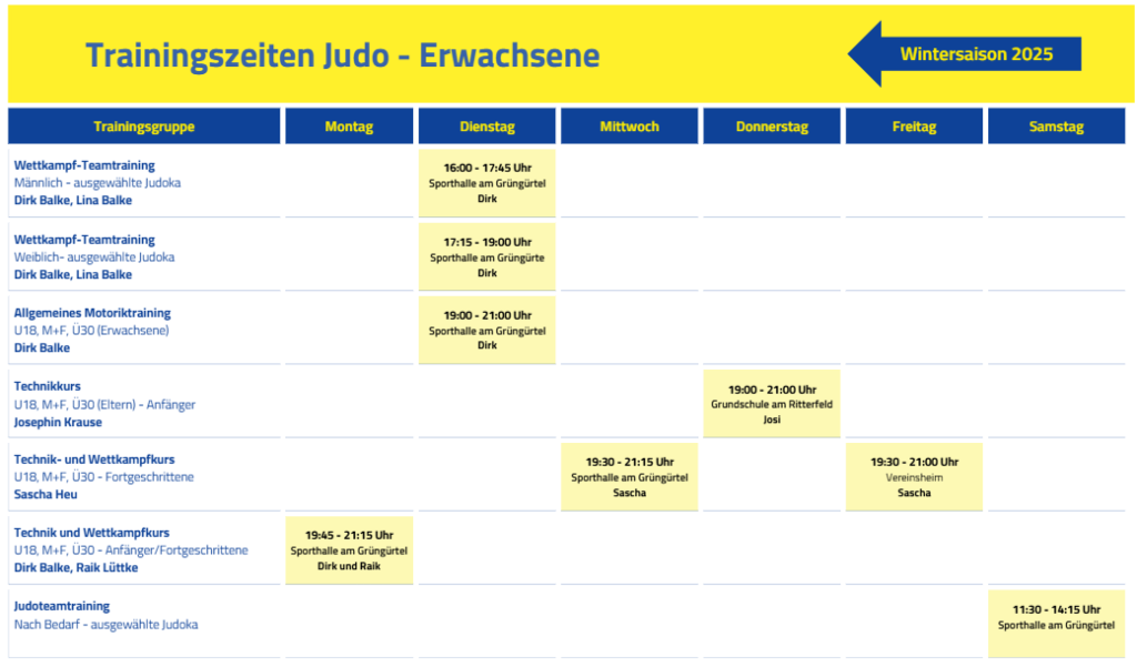 hier findet ihr eine Übersicht aller Trainingszeiten im Erwachsenenbereich unserer Judo-Sparte, ebenso wo ihr bei wem trainiert: