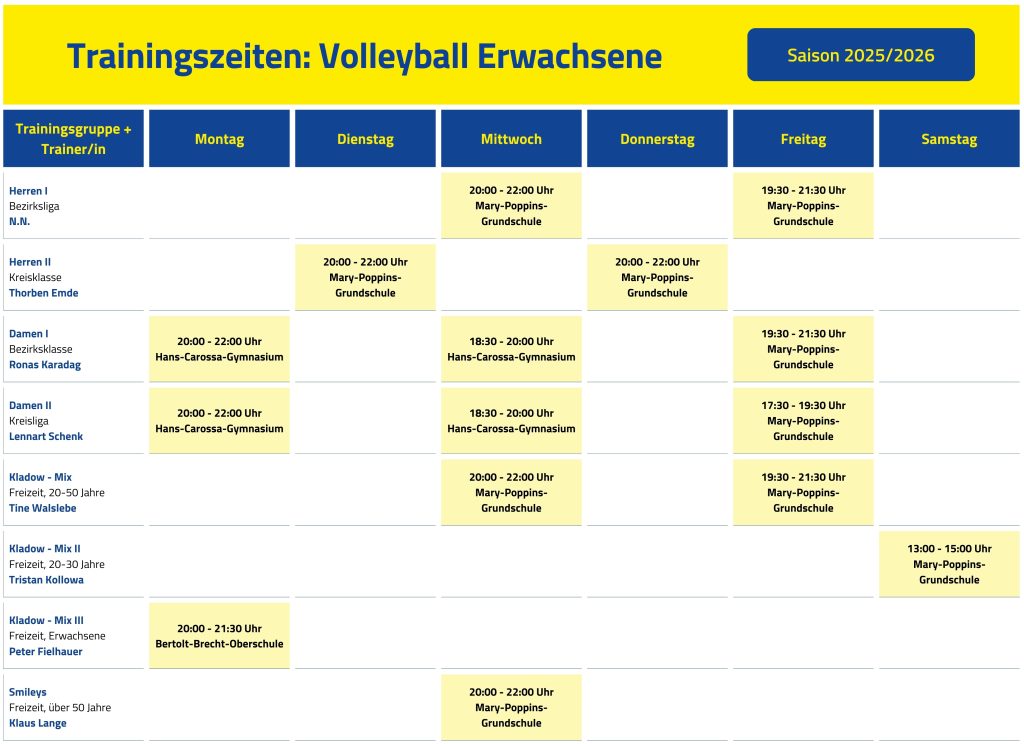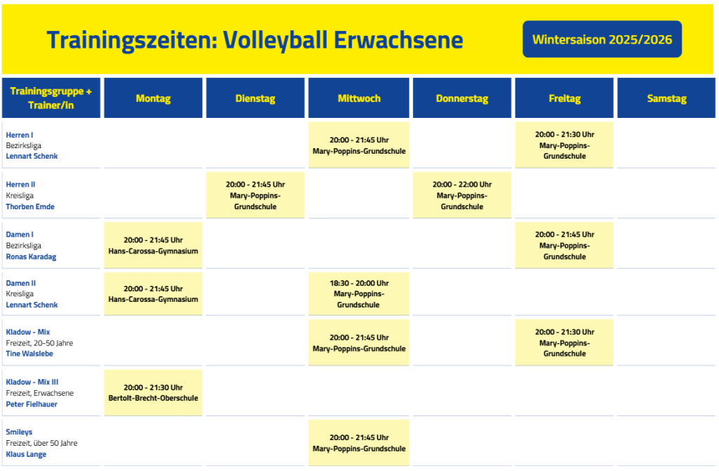 hier findet ihr eine Übersicht aller Trainingszeiten der Erwachsenenteams unserer Volleyball-Sparte, ebenso wo sie bei wem trainieren:
