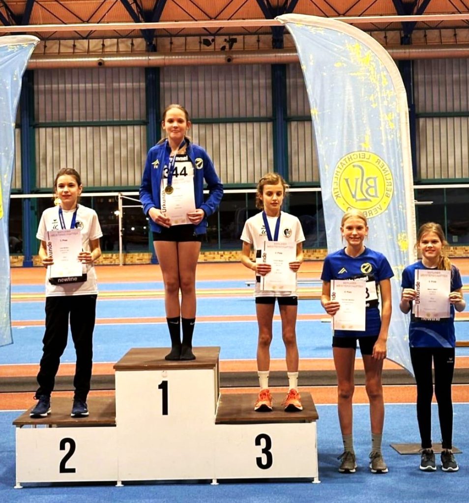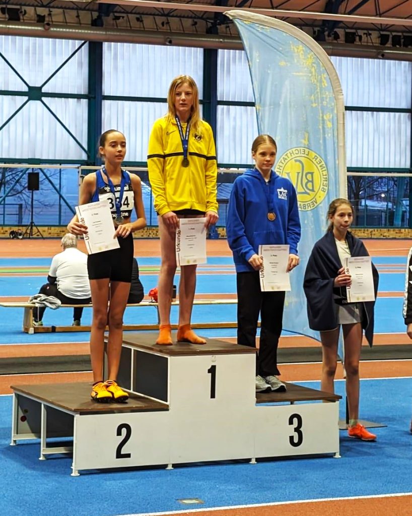 Die W12 Mädchen haben dann die Halle gerockt. Melissa, Jana und Malina haben jeweils ihre Hürden-Zeitläufe mit 1,5-2 sek. Vorsprung gewonnen und tatsächlich das Triple geschafft – Berliner 60m-Hürden-Meisterinnen mit Gold, Silber und Bronze.