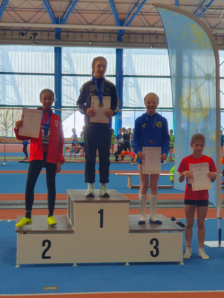 Auch bei den 60m lief es gut für die Mädels, Melissa und Vanessa haben ihre Vorläufe gewonnen, Malina, Charlotte und Jana holten jeweils den zweiten Platz in ihren Vorläufen, Jordan den vierten und Lennja den sechsten Platz. Am Ende reichten die Zeiten nur bei Melissa und Jana für die Endläufe, bei denen sie sich dann den Meistertitel und den fünften Platz erlaufen haben.