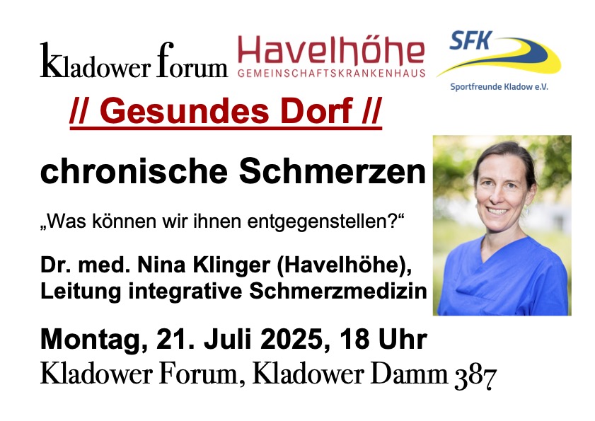 Zusammen mit den Sportfreunden Kladow und dem Gemeinschaftskrankenhaus Havelhöhe beginnen wir ein Gesprächsforum zu Themen, die für ein „Gesundes Dorf“ relevant sein können: Themen wie Schmerz, Rehasport, Umgang mit Sportverletzungen etc.. Aber auch: hat die Krankenhausreform Auswirkungen auf die Versorgung in unserer Region? Die Geschichte des Ortes Havelhöhe. Was ist nötig, um unser „Dorf“ gesund zu halten? Dazu gehört Vieles. Die Ärztelandschaft, die Physios, Therapeuten, der Sport, die Seelsorge (ja auch das). Da fehlt bestimmt noch einiges in der Aufzählung.“