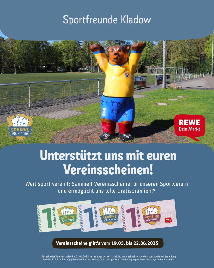 Bei REWE einkaufen, Vereinsscheine nicht vergessen und ab zu uns in den Verein bringen, selbst scannen in der REWE App im Bereich „Scheine für Vereine“ oder über die Website rewe.de/scheinefürvereine online den Sportfreunden Kladow zuordnen.
