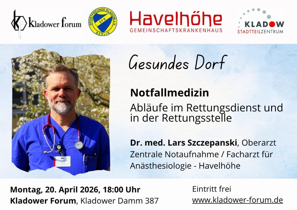 Unser jüngstes Gemeinschafts-Projekt ist, zusammen mit dem Krankenhaus Havelhöhe, die Reihe >> Gesundes Dorf <<. Hier haben Sie und wir alle innerhalb von Vorträgen und Gesprächen zu verschiedenen Gesundheitsthemen die Möglichkeit, Fragen zu stellen, mit zu diskutieren oder sich einfach „nur“ zu informieren – immer am dritten Montag des Monats, Start jeweils um 18 Uhr im Kladower Forum, Kladower Damm 387 und neu – vereinzelt auch im Stadtteilzentrum Kladow, Sakrower Landstraße 3 – bitte stets auf die aktuellen Aushänge achten.