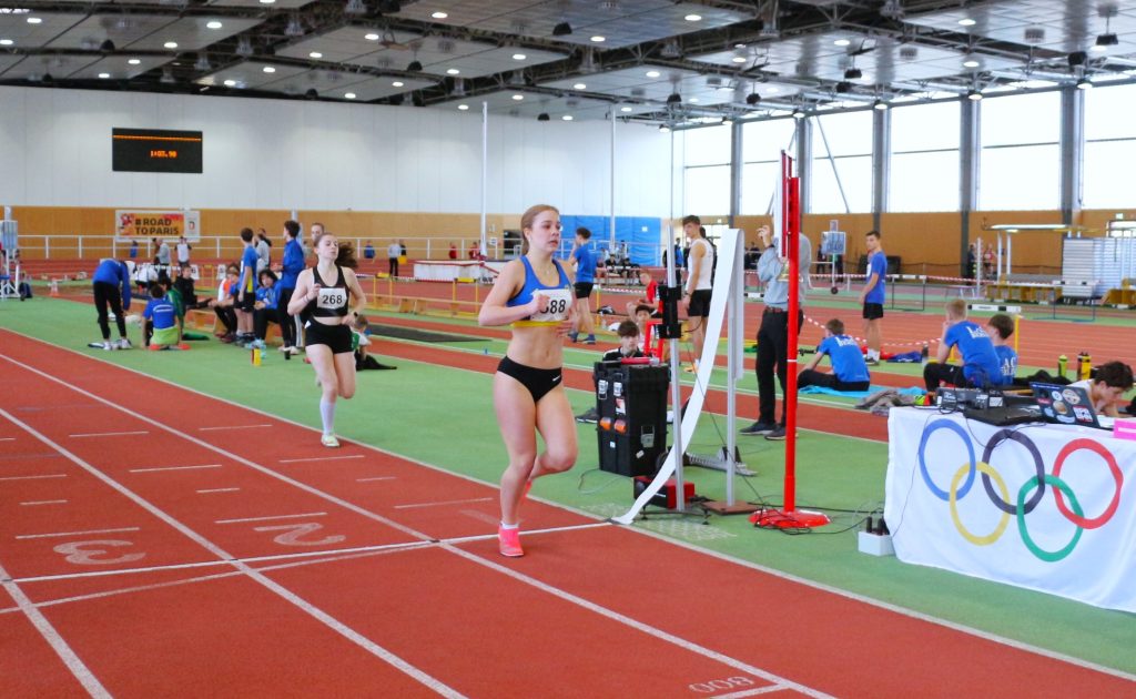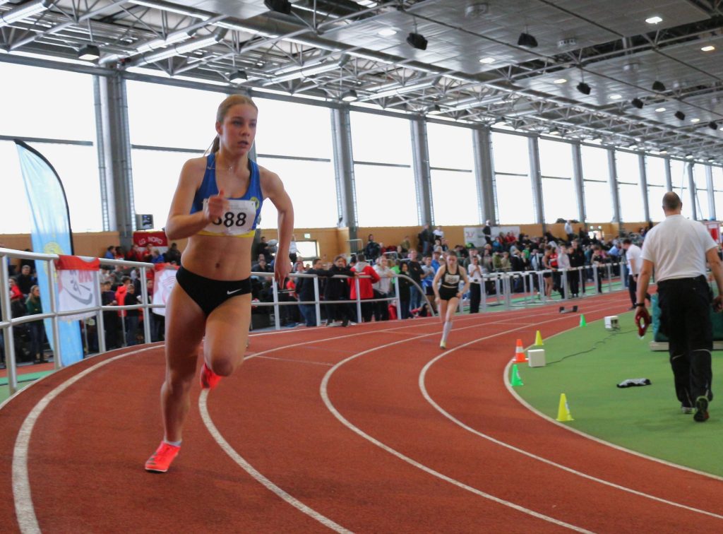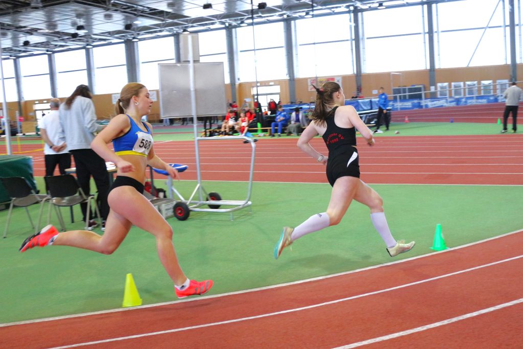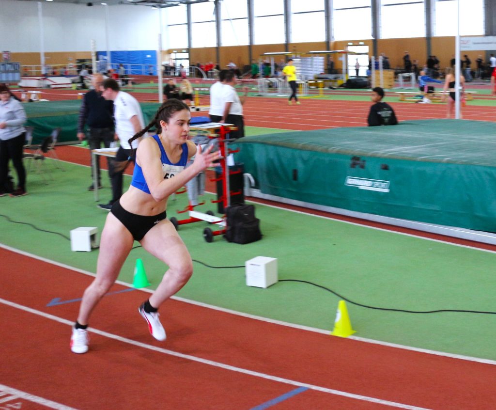 Kai: „Sina wagte sich auch in dieser Woche an die 400 m – das hieß zwei Runden in der Halle am Luftschiffhafen. Sie war total cool und gelassen und ist auch genauso „abgebrüht“ ihre Strecke gelaufen. Erst blieb sie im Windschatten ihrer Gegnerin, ist aber hinten raus noch an ihr vorbei gezogen, super Einteilung!“ – Sina: „Vorher war ich nicht wirklich aufgeregt, das kam erst, als ich im Innenraum auf meinen Lauf gewartet habe. Da ich auf Bahn 4 starten musste, war es ein anderes Gefühl, die steilen Kurven zu laufen, als wenn man auf den flacheren Bahnen 1 oder 2 ist. Zudem muss man die ersten 150 m sehr aufpassen, wirklich in der Bahn zu bleiben und erst dann in die Innenbahn reinzuziehen. Auch wenn ich meine Bestzeit knapp verfehlt habe, war ich mit dem Wettkampf und dem Verlauf doch sehr zufrieden. Es hat wieder sehr viel Spaß gemacht!“