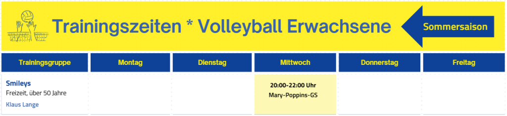 Unsere Mixed-Freizeitgruppe, die „Smileys“ trifft sich vor allem zum wöchentlichen Spielen ohne Leistungsdruck. Für etwas engagiertere Spieler werden auch hin und wieder interne oder externe Turniere angeboten. Im Großen und Ganzen darf aber einfach jeder mitmachen, der einen Volleyball übers Netz befördern kann.