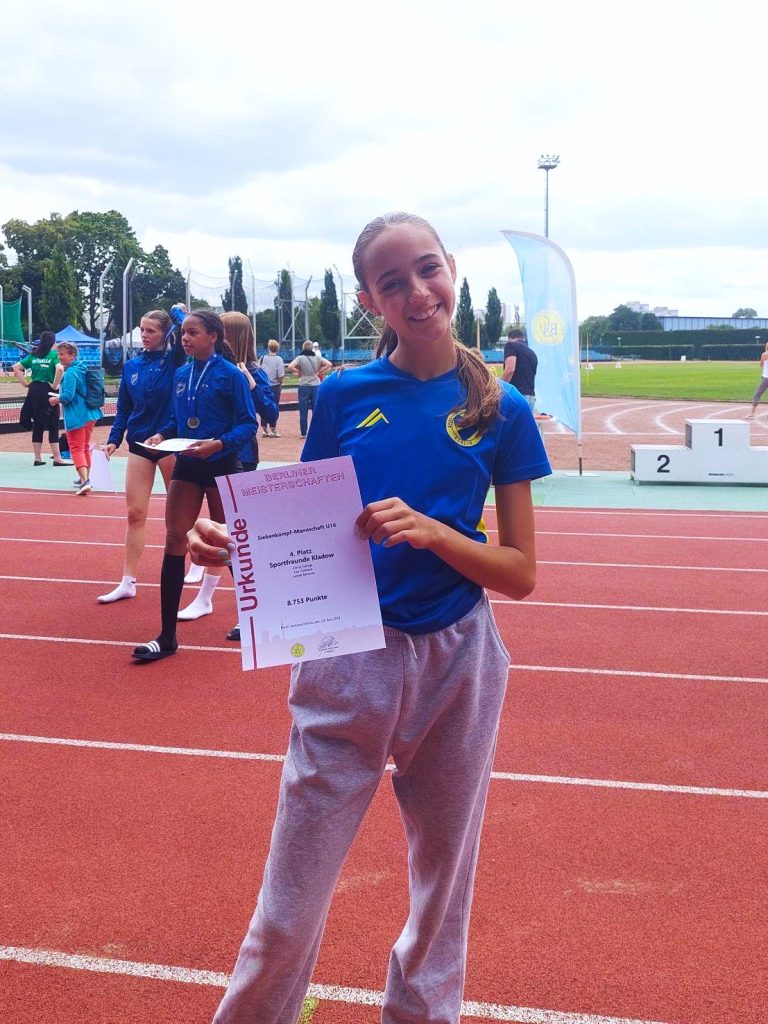 Olivia und Leonie gingen für die W15 der Sportfreunde Kladow an den Start, auch sie zum ersten Mal in einem Siebenkampf. Olivia erreichte souverän mit tollen Disziplin Ergebnissen Platz 1. Leonie machte einen guten Wettkampf und holte wertvolle Punkte für die Teamwertung im Siebenkampf der W14/W15 (U16). Gemeinsam mit Lea aus der U14 landeten sie mit starken 8753 Punkten auf Platz 4.