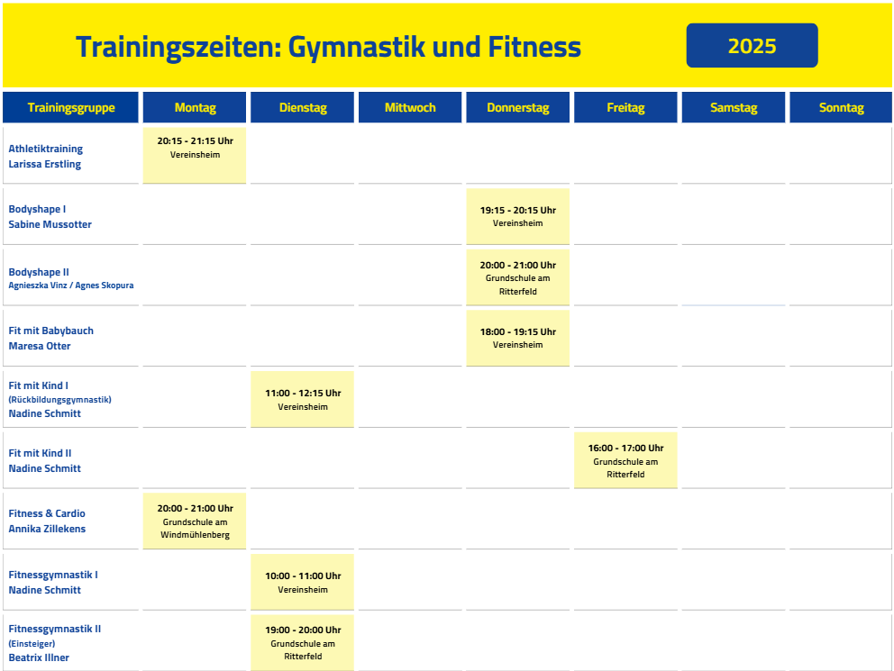 Die Abteilung Gymnastik und Turnen bietet unter anderem ein breites Spektrum an Fitness- und Gesundheitssportkursen für Erwachsene. Das Angebot reicht von Bodyshape über Gymnastik, Pilates bis hin zu Rehasport.