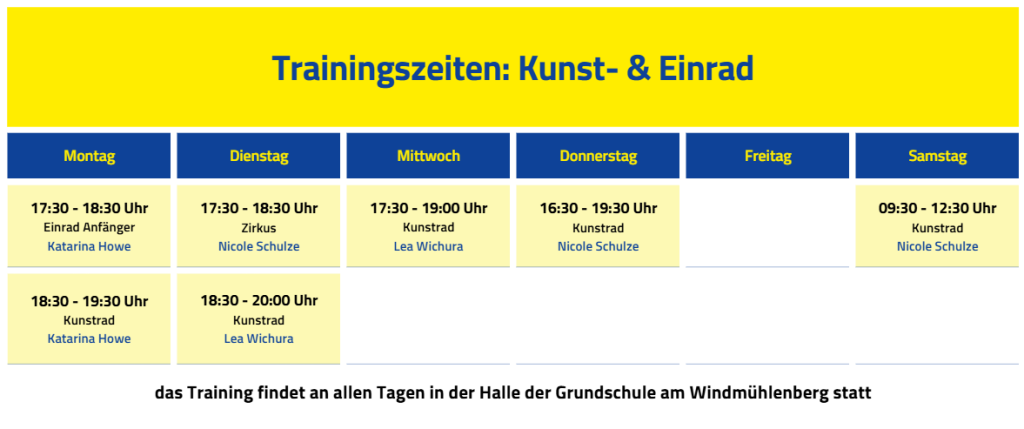 Die Adresse der Sporthalle, in der alle Trainingseinheiten stattfinden, sowie die Trainer & Trainerinnen, aber auch an wen ihr euch bei Fragen rund ums „Kunst- & Einradfahren“ wenden könnt findet ihr weiter unten auf dieser Seite, ebenso Berichte von Wettkämpfen und mögliche Termine.
