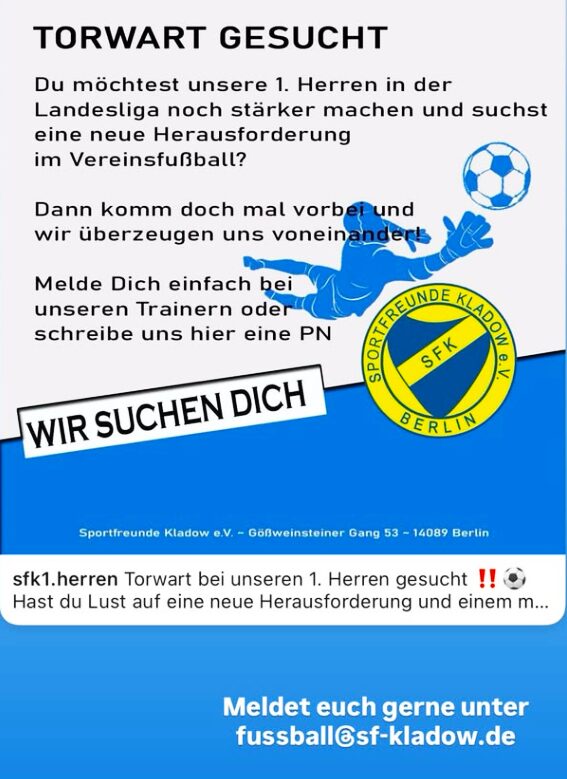 Kladows blau-gelbe Fußballfamilie sucht Familienzuwachs: Es ist noch Platz zwischen den Pfosten bei den 1. Herren – DU hast Lust auf eine neue Herausforderung und auf ein motiviertes cooles Team? Dann bist du bei uns genau richtig!