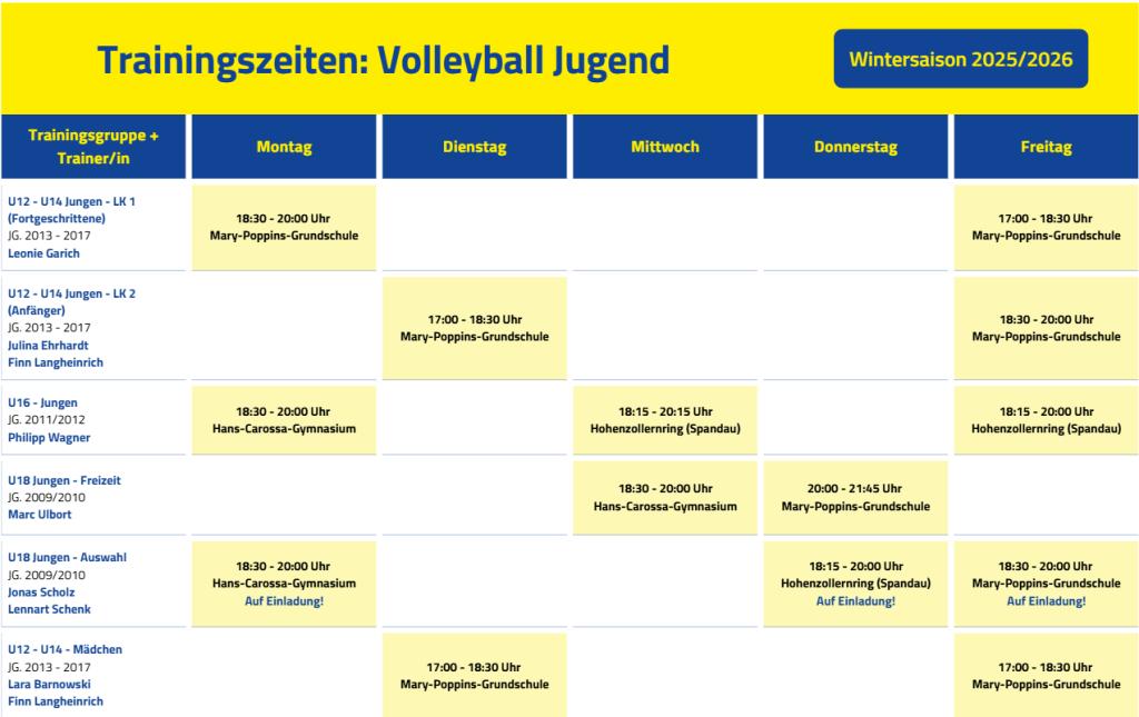 Trainingszeiten: Volleyball Jugend